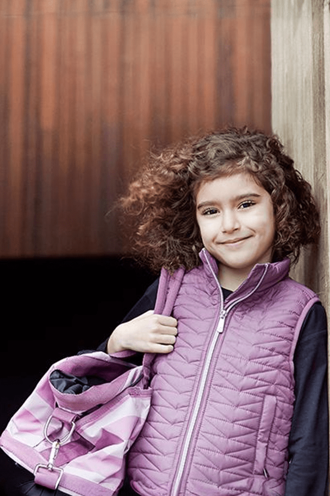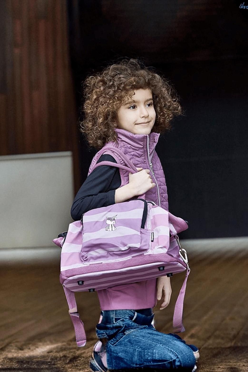 Strigletaske til børn med striber og en lille enhjørning på lommen foran.