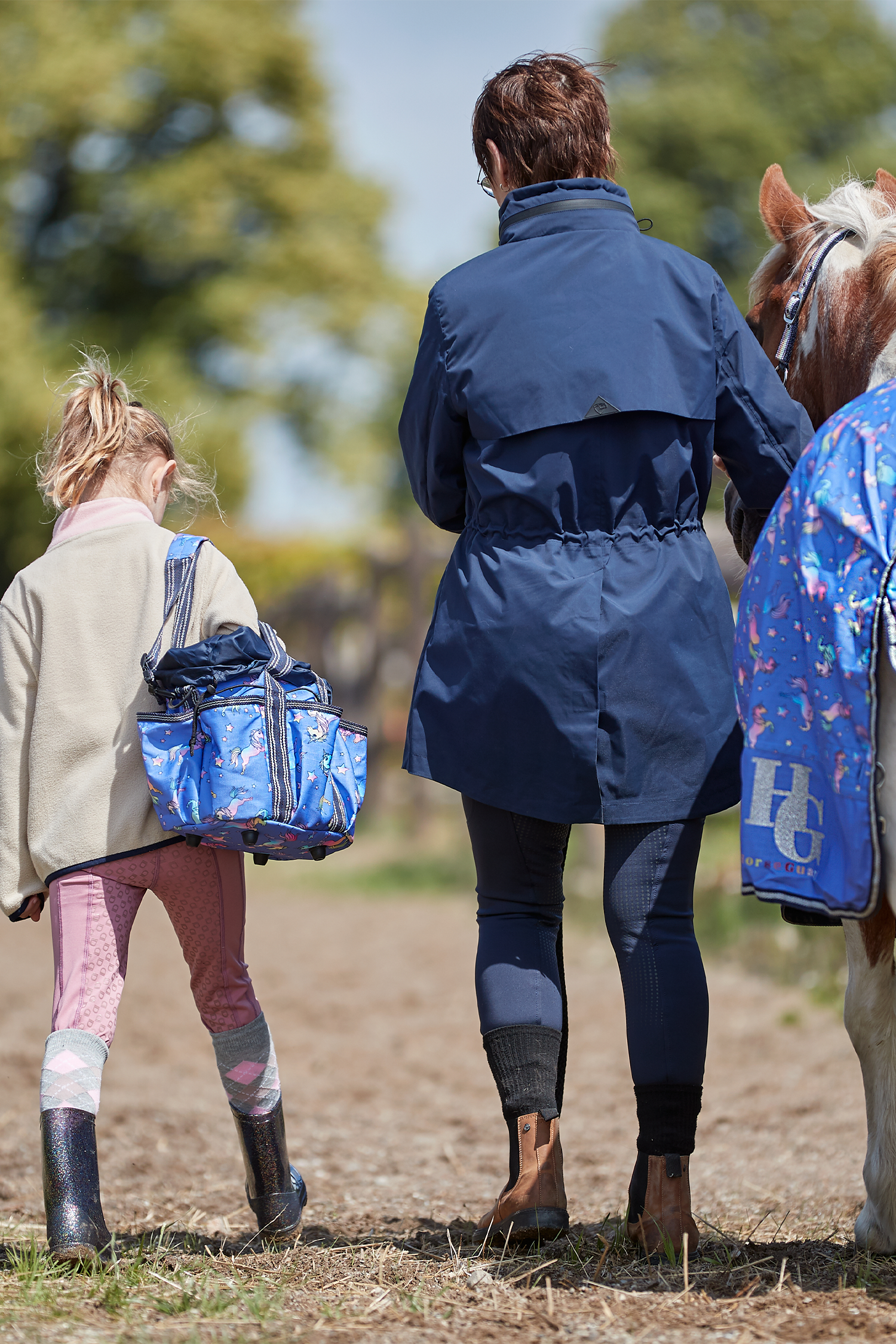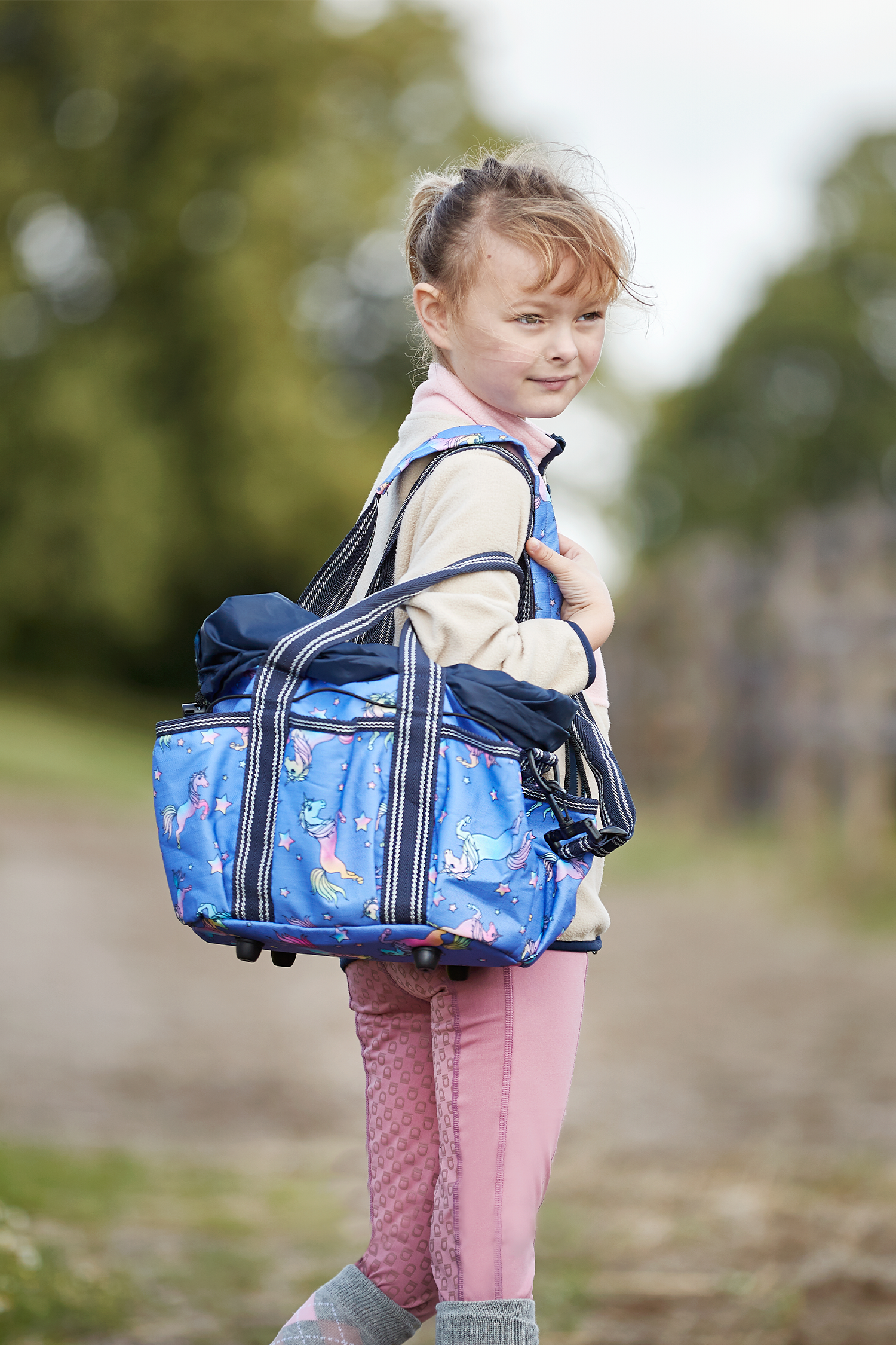 Slidstærkt materiale med et legende, flerfarvet enhjørningedesign.