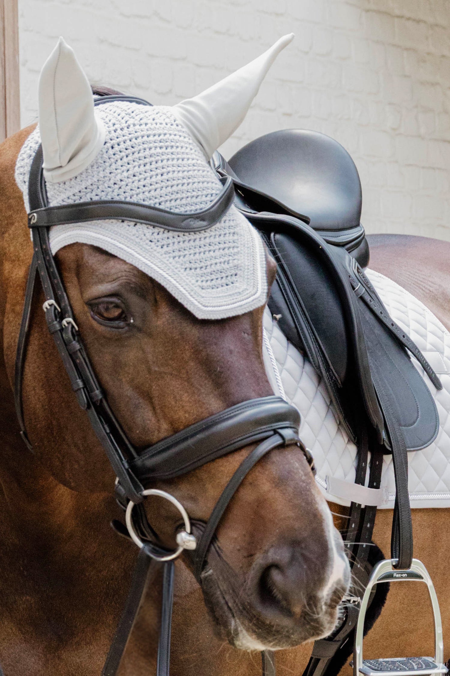 De elastiske ører i blødt stretchmateriale sikrer høj komfort og reducerer forstyrrende lyde, perfekt til heste der har brug for ekstra fokus under træning eller konkurrence. Fluehætten er udsmykket med to eksklusive passpoiler, som giver et sofistikeret og professionelt udtryk på stævnebanen.