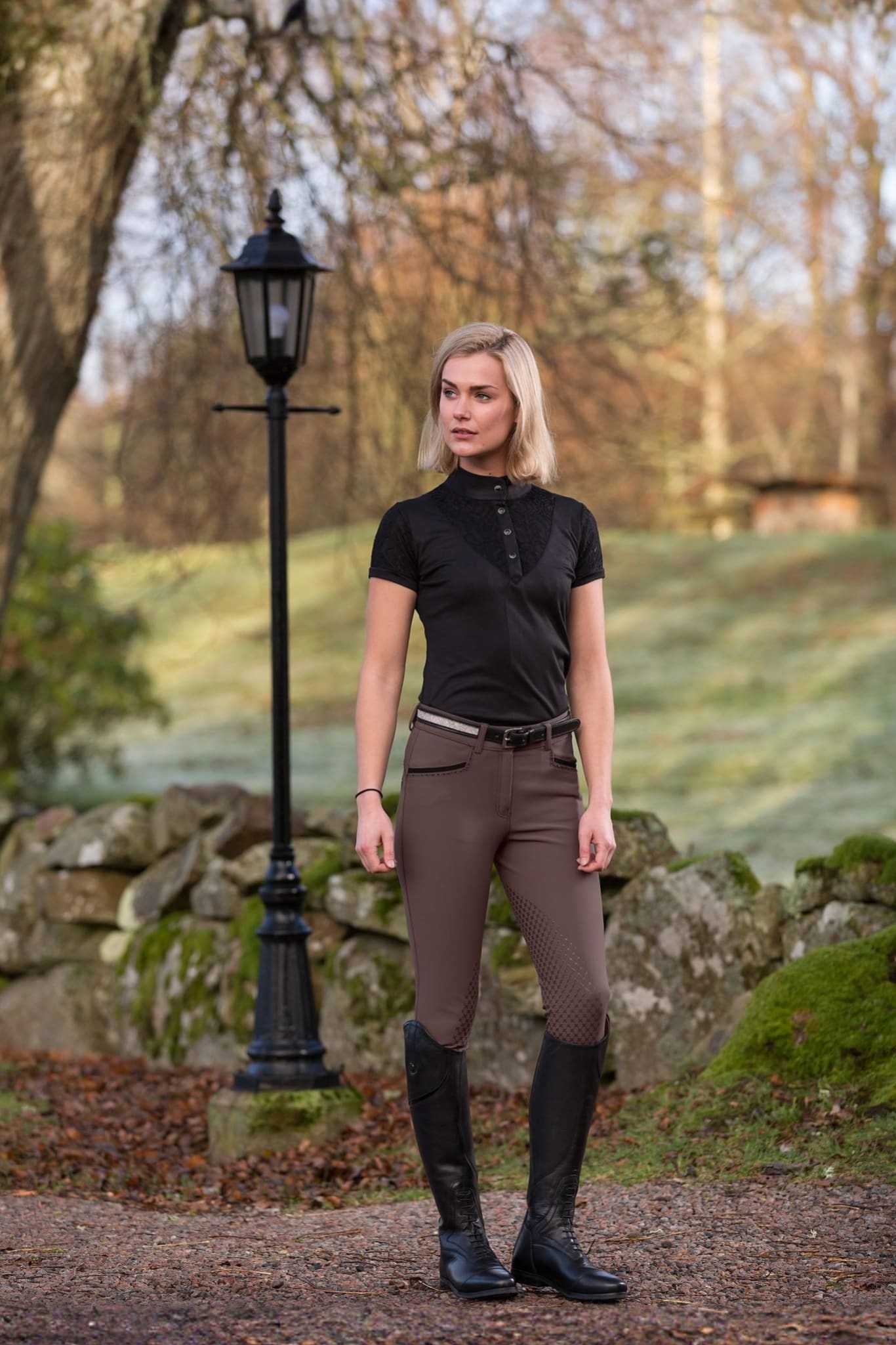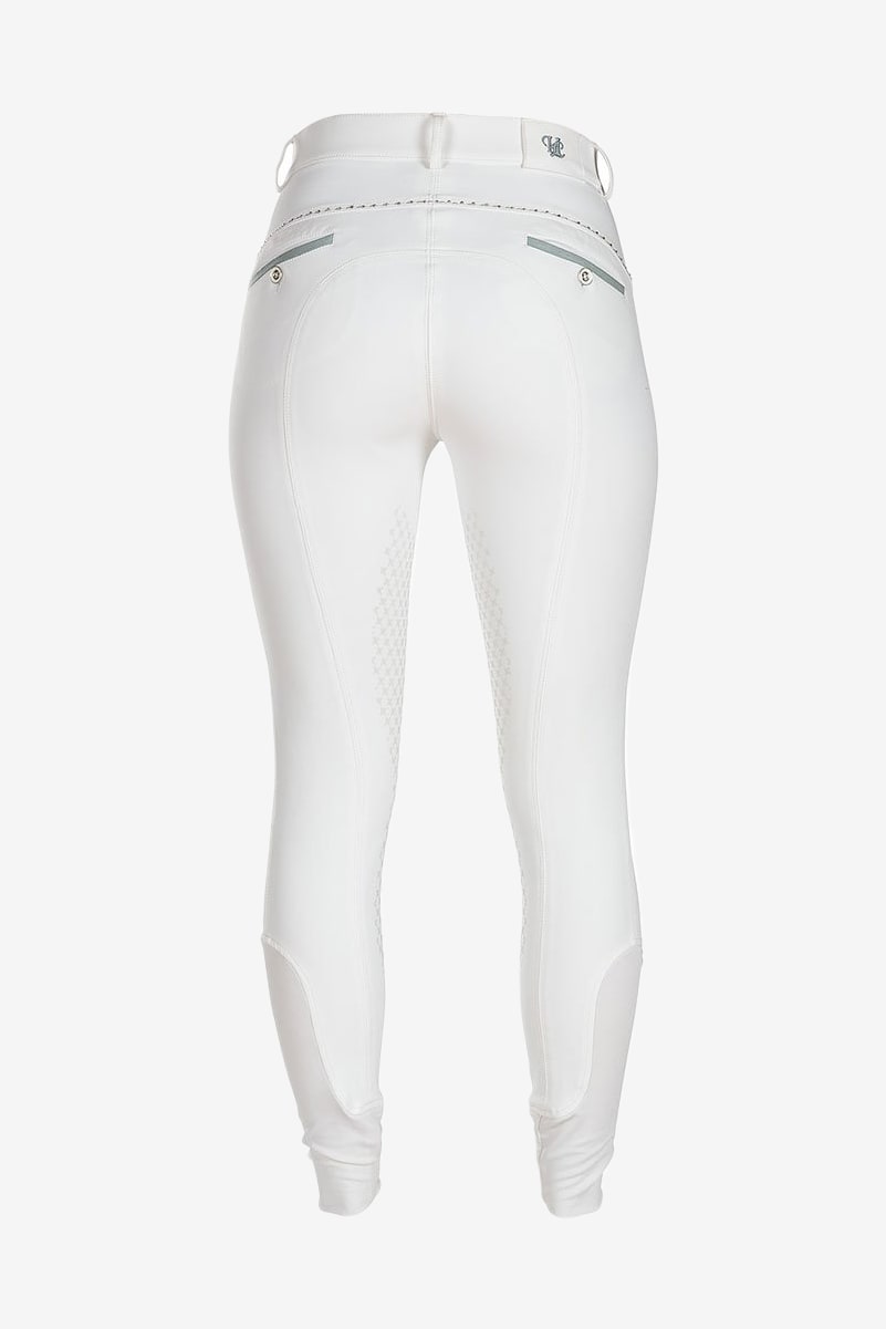 Ridebukser til børn fremstillet i super-x nylon/lycra, et slidstærkt funktionelt materiale, som er vandafvisende og meget holdbart med firevejs stretch. Sadelmodel med silikone på indersiden af benet. Skrå forlommer og skjulte baglommer med knap. Clarin-detaljer og dekorsøm med sten. Benafslutning med lycra.