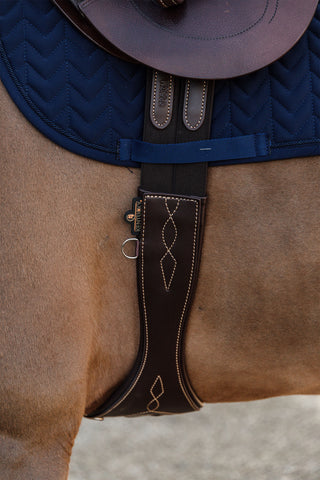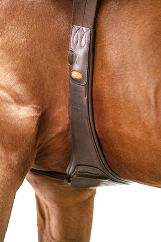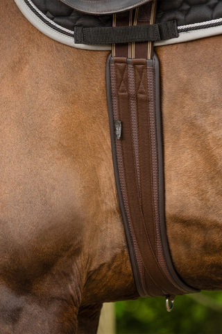 Une sangle anatomique se distingue des sangles classiques par une forme qui s'adapte à la morphologie et à la structure des jambes du cheval. Elle est souvent conçue avec une légère courbure et une partie extra large au niveau du poitrail du cheval afin de minimiser la pression sur les zones sensibles, telles que le sternum et les côtes. Cette forme suit les lignes naturelles du ventre du cheval, ce qui permet à la selle de rester en place sans causer d'inconfort ou de frottement.