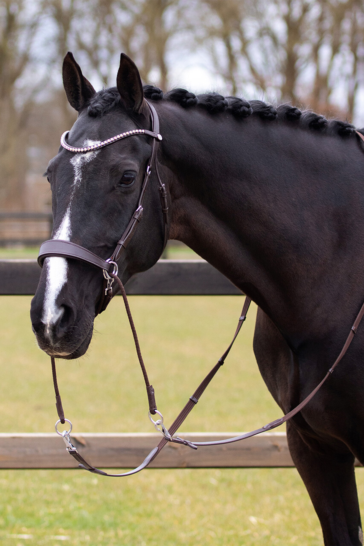 Cette bride peut être utilisée en sidepull, croisée sous le menton ou croisée sous la mâchoire, ce qui en fait une solution polyvalente aussi bien pour les cavaliers qui veulent essayer différentes variantes que pour ceux qui ont besoin de flexibilité dans leur équitation. Les clips pratiques sur les sangles et les rênes permettent un ajustement rapide et facile selon les besoins.
