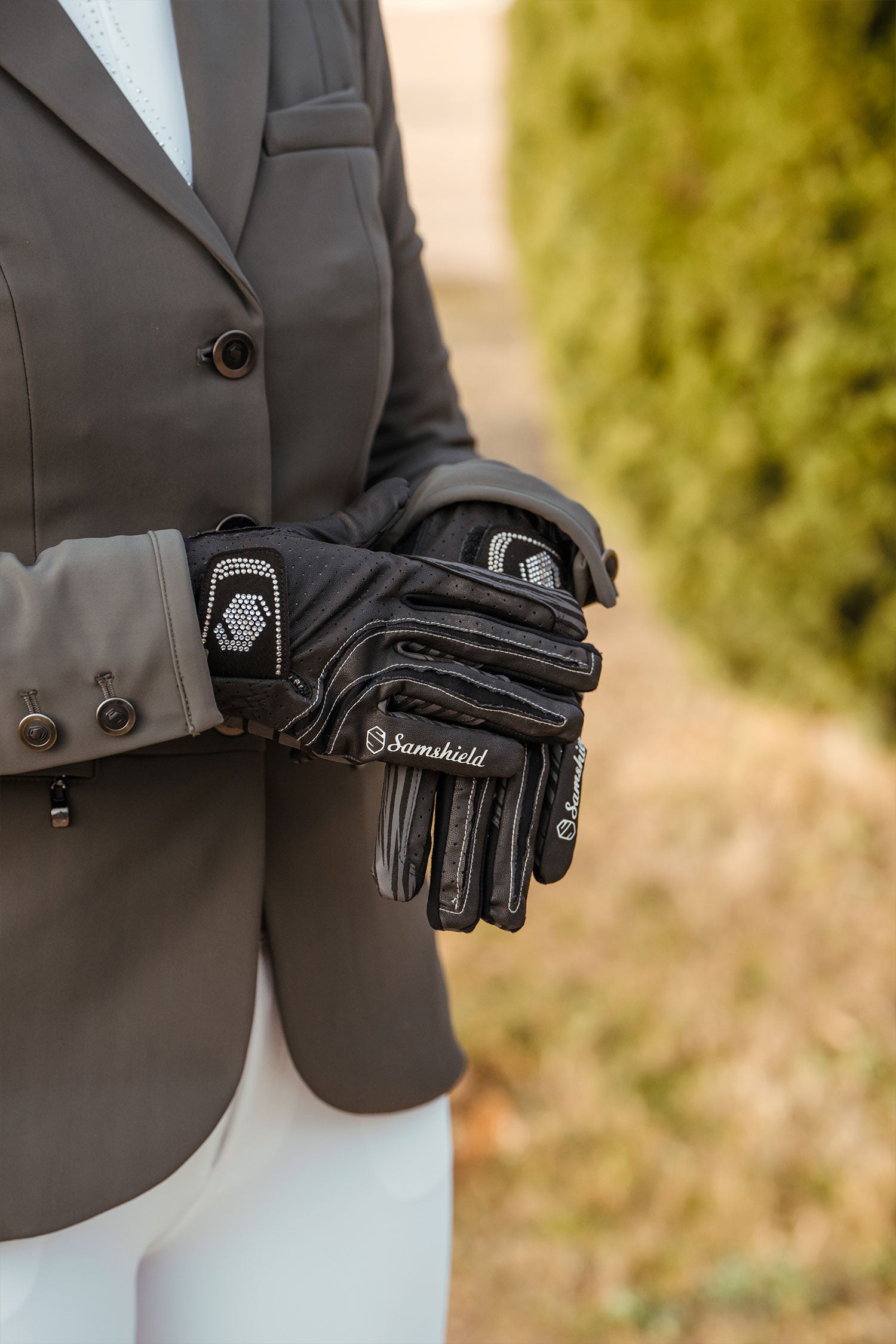 La best-seller Victorine SS24 dans un nouveau design élégant avec des bandes en crystal fabric sur le col et l’ourlet, assorties aux casques d’équitation Samshield.