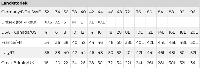 Vous achetez en tailles françaises ; consultez le tableau ci-dessous pour comparer avec les tailles suédoises.
