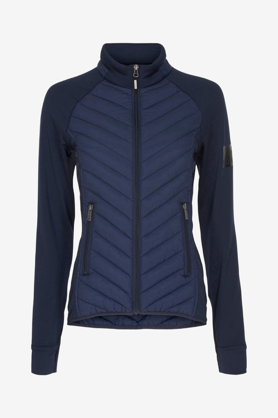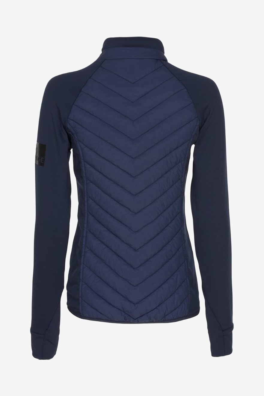 Hybride jas van Equipage in twee lagen die verwarmende voering aan de voor- en achterkant combineert met rekbaar functioneel materiaal aan de zijkanten en op de mouwen. De ergonomische pasvorm maakt de jas zeer geschikt voor bijvoorbeeld paardrijden en andere buitenactiviteiten waarbij goede bewegingsvrijheid vereist is. De jas is ontworpen met een hoge, beschermende kraag, twee praktische zijzakken met rits, duimgaten aan de mouwuiteinden die de mouwen op hun plaats houden, en een ritssluiting over de volledige lengte voor verstelbare ventilatie.