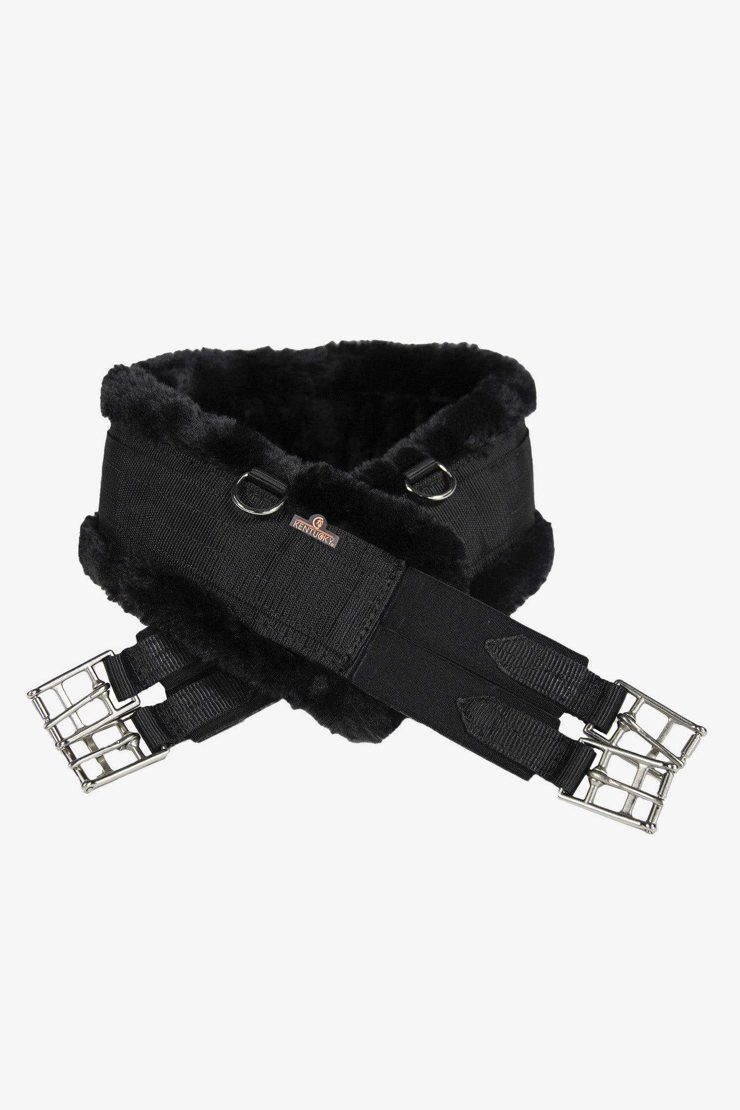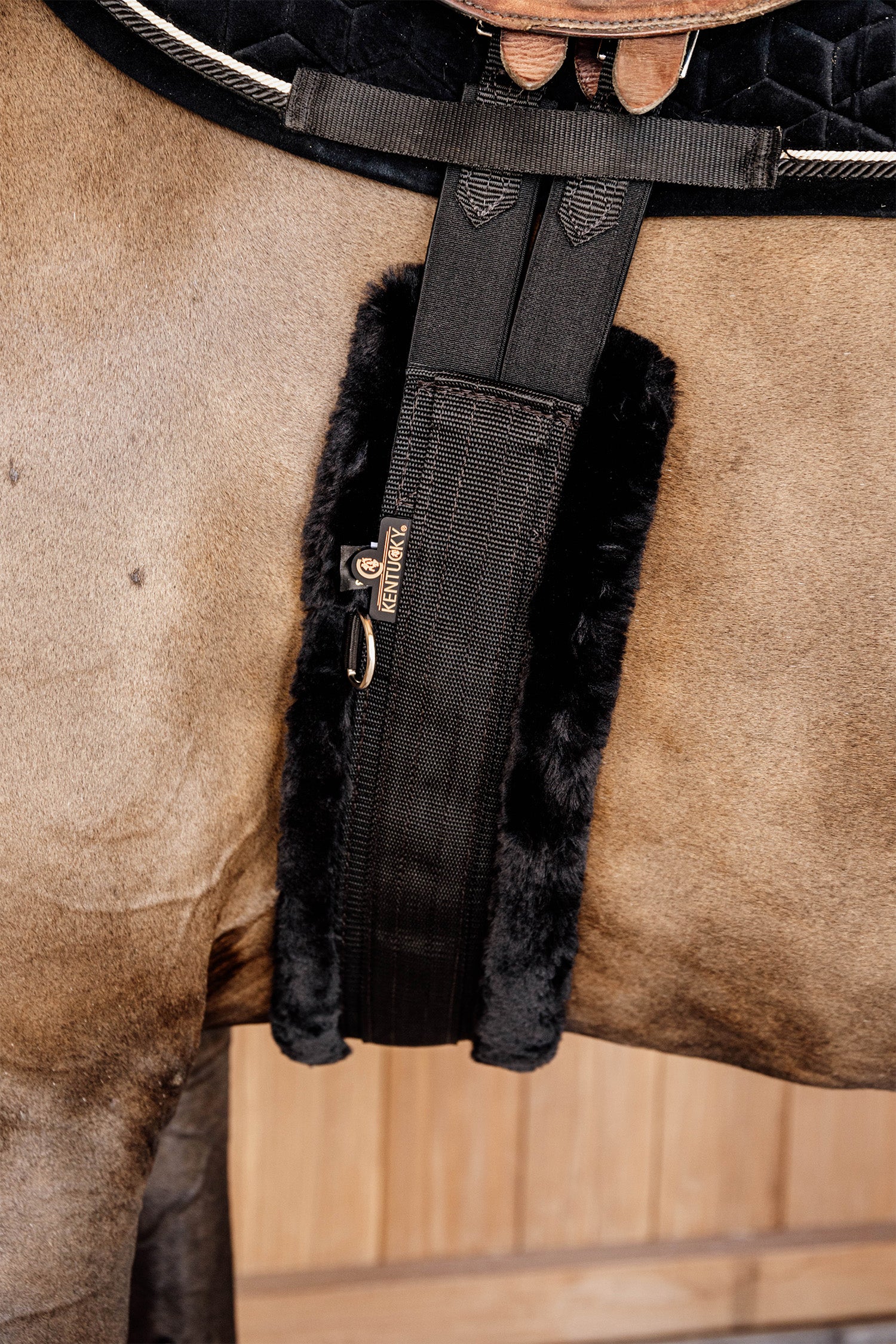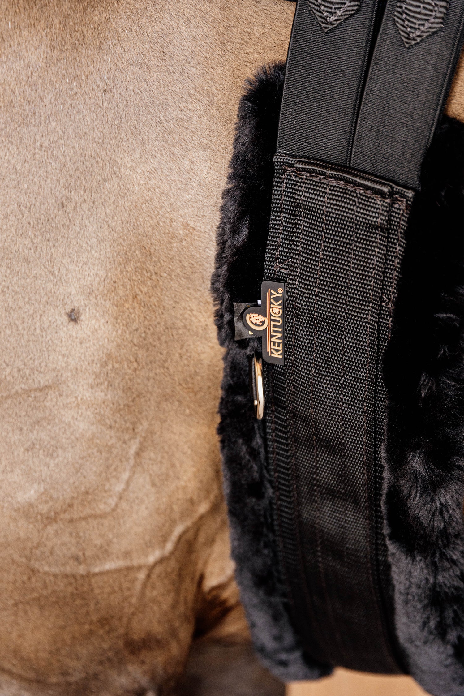 De lamsvelsingel heeft elastiek aan beide uiteinden voor een gelijkmatige drukverdeling, evenals drie D-ringen voor het bevestigen van verschillende hulpteugels. De elastieken zijn zeer sterk en blijven stabiel doordat ze met driedubbel elastiek zijn gestikt. Net als de andere producten van Kentucky is deze 100% diervriendelijk dankzij de kunstlamsvel voering.