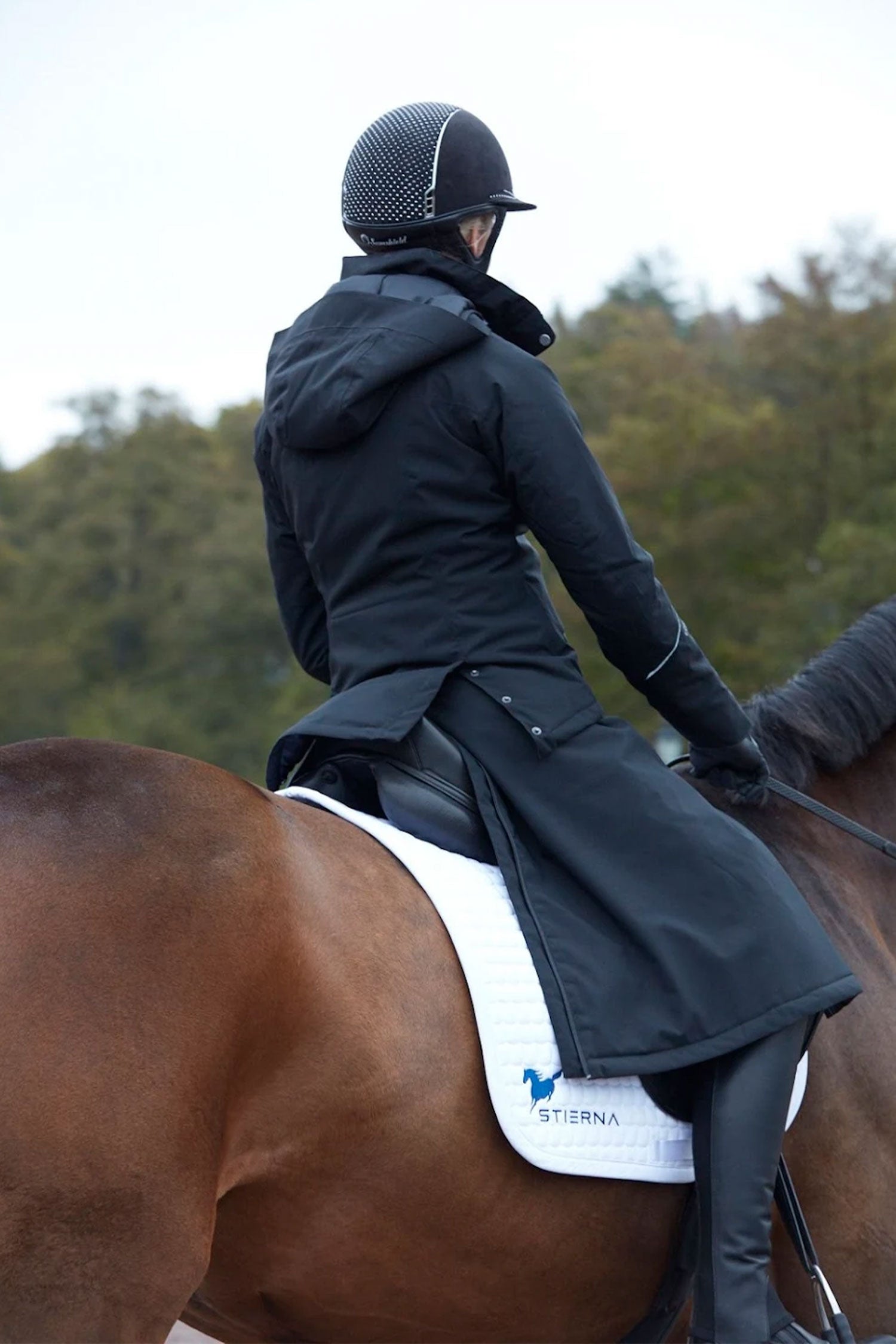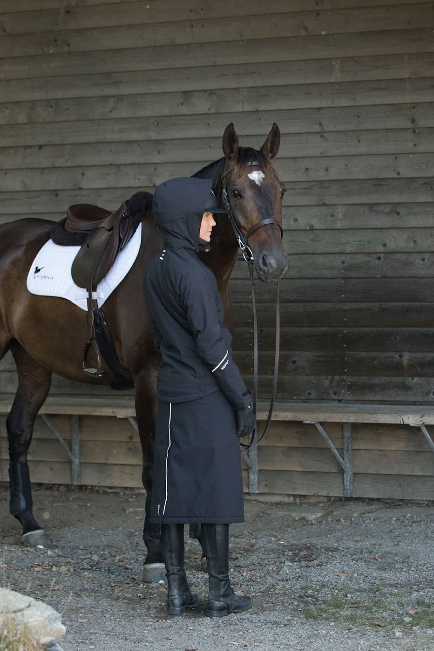 Een rijrok in twee lagen EquTex™ stretch die je beschermt tegen sneeuw, regen en wind, terwijl overtollige warmte en vocht van het lichaam worden afgevoerd. Het buitenmateriaal is wind- en waterdicht met getapete naden en gevoerd met een donsvrije voering die je warm houdt als het koud wordt. Lange tweewegrits aan zowel de voor- als achterkant voor eenvoudig en soepel aan- en uittrekken van de rok. Elastische banden aan de binnenkant houden de rok op zijn plaats. Verstelbare taille met klittenbandsluitingen. Ruime zak met rits voor veilige opslag van waardevolle spullen. Reflecterend logo en biezen voor extra veiligheid.