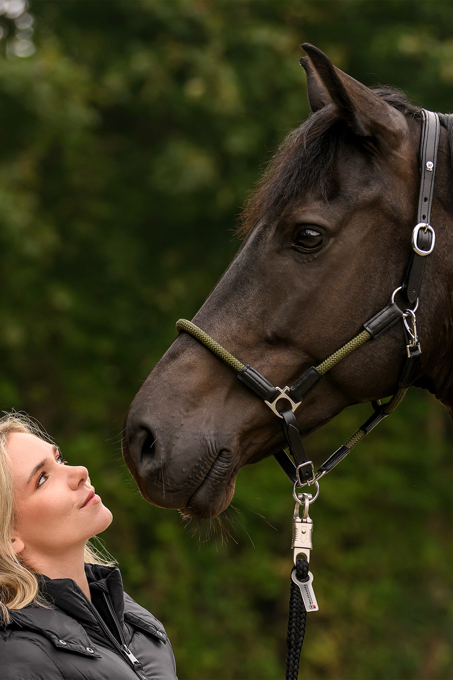 Sportief halster van zacht leer dat zowel comfort als stijl biedt voor dagelijks gebruik. Het kopstuk is extra zacht om druk te verminderen en een comfortabele pasvorm te garanderen, terwijl touwdetails zorgen voor een moderne en doordachte uitstraling. Het halster is eenvoudig te verstellen bij zowel het kopstuk als de kin, waardoor het stevig en veilig op het paard blijft zitten.