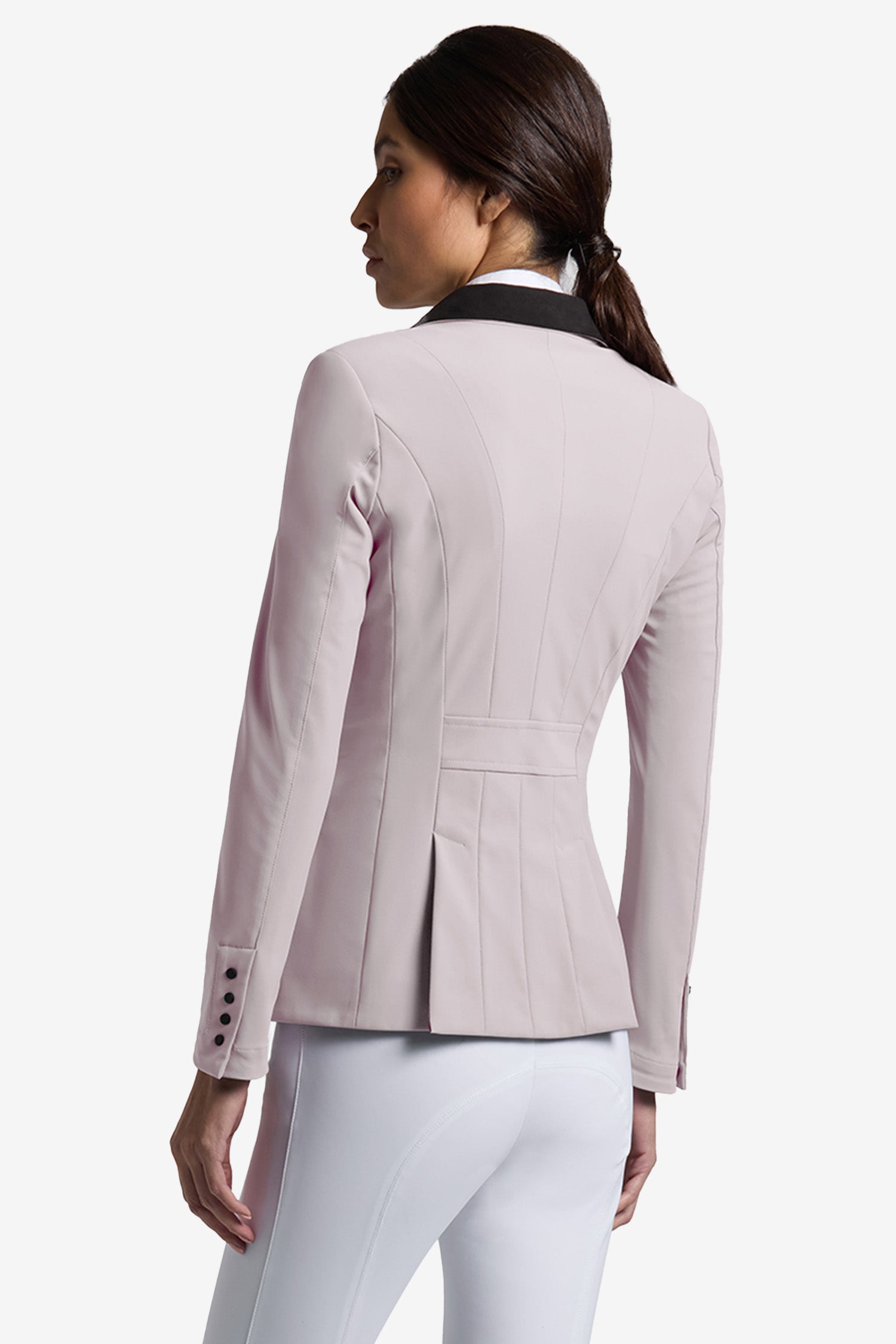Kavajen är tillverkad i ett högteknologiskt stretchmaterial som är andningsbart och följsamt. Tyget formar sig efter kroppen och ger en smickrande passform samtidigt som det ger full rörelsefrihet i sadeln. Materialet är lätt, snabbtorkande och behåller sin struktur även under långa tävlingsdagar.
